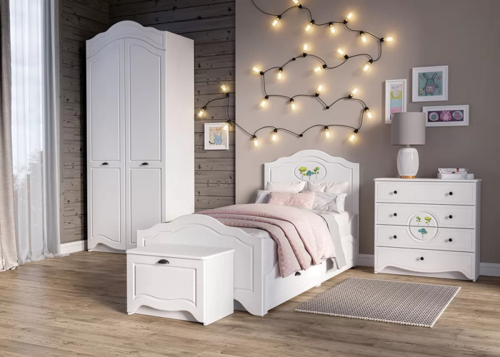Комод Роуз 13.297 прекрасно впишется в интерьер детской комнаты, а также привнесет яркие нотки. Теперь у ребенка появится дополнительное место для бережного хранения одежды и нижнего белья, разнообразных аксессуаров и игрушек. Комод оснащен четырьмя выдвижными ящиками. Сверху на комоде можно разместить несколько памятных фотографий и оригинальные предметы декора. Декор и рисунок на фасадах способствуют созданию сказочной атмосферы.
