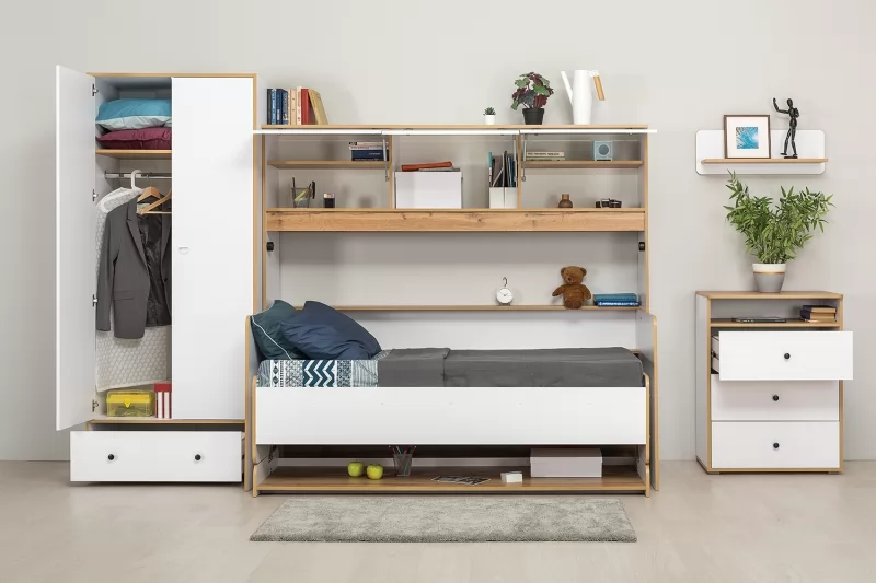 Светлая и аккуратная молодёжная мебель. Основой модульной системы является кровать-трансформер. Её столешница имеет постоянный горизонт, то есть при трансформации не нужно убирать вещи. Система хранения с подъёмными фасадами значительно расширяет функционал.