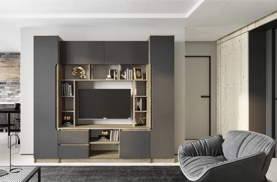 -все предметы изготовлены в одном стиле, словно детали одного конструктора, позволяют создать уникальную комбинацию гостиной; -слегка шероховатая матовая текстура фасадов благородного серого цвета с эффектом декоративной штукатурки в сочетании с -корпусом, выполненном под натуральный дуб подчеркнут ваш безупречный вкус и индивидуальность; -трендовые цветовые решения, строгий фасад и отсутствие лицевой фурнитуры делают коллекцию не только стильной, модной, но и практичной.