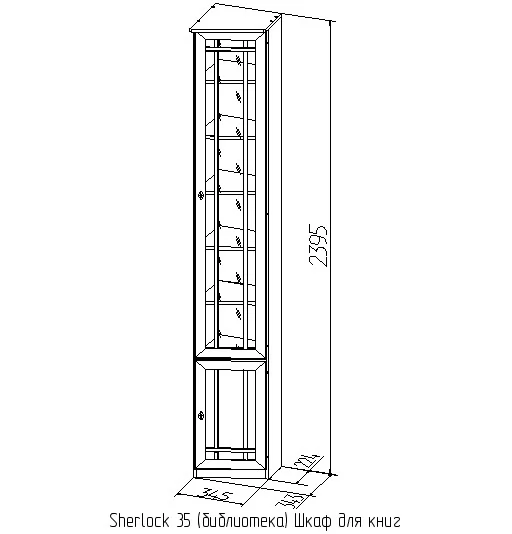 Высокий библиотечный шкаф со скосом влево гармонично завершает компоновку из шкафов библиотеки Sherlock, глубина зауженной части составляет 170 мм. Шкаф со скосом вправо называется Sherlock 35 Шкаф для книг. Библиотечный шкаф можно установить в комнату с высотой потолка не менее 240 см. Высота полок во всех шкафах для книг регулируется, для этого необходимо только установить полкодержатели на нужной высоте в подготовленные отверстия. Это позволит поставить на полки книги и альбомы разного формата. Нагрузка на одну полку не должна превышать 13 кг. Тонированное стекло защищает книги от вредного воздействия солнечных лучей и убережет их от пожелтения. Книжный шкаф обязательно крепится к стене за подвесы и межсекционной стяжкой с другими шкафами в наборе. Библиотека выпускается без выборки под плинтус, чтобы каждый мог прирезать плинтус индивидуально.
