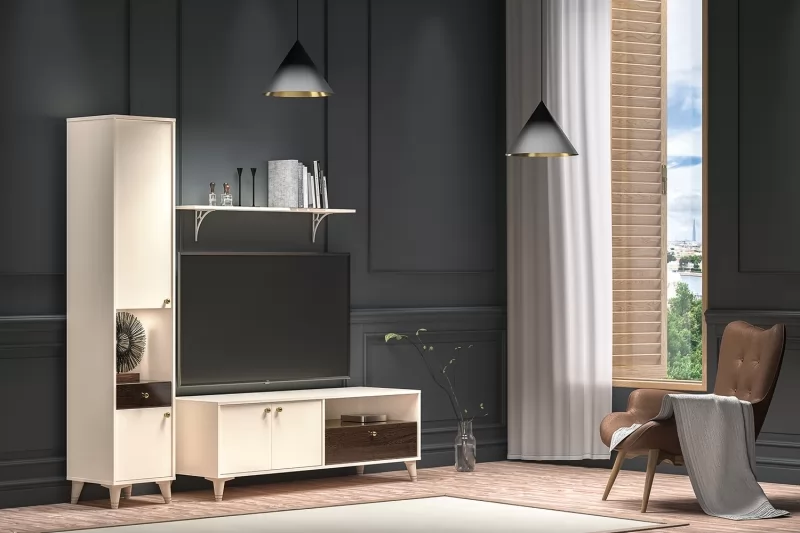 Тумба ТВ "Миндаль" №13.260 включает в себя вместительную секцию за распашными дверцами, выдвижной ящик и открытую нишу.