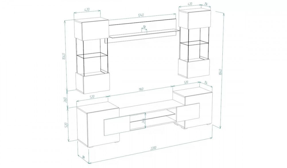 • Габариты 2200(Ш) х 354(Г) х 520(В) мм.