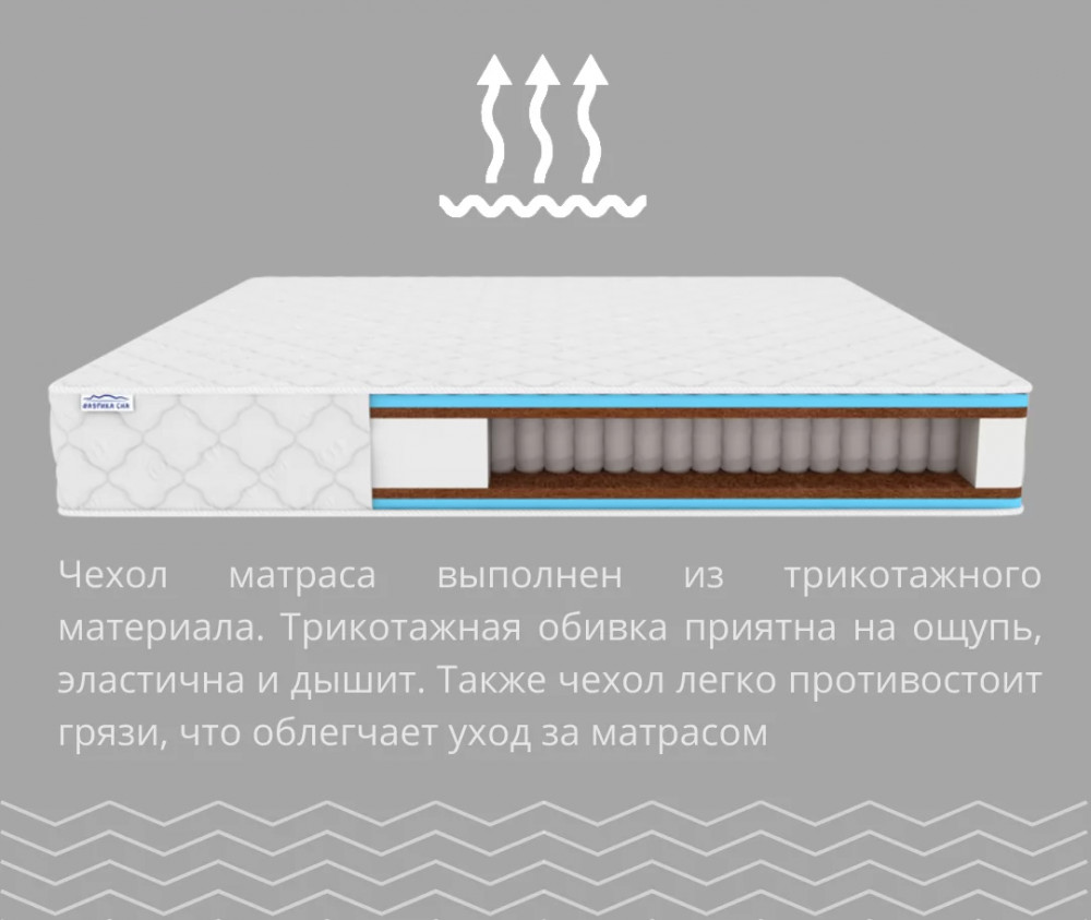 Чехол в трикотажной обивке: Чехол матраса выполнен из трикотажного материала, легко снимается и стирается, что облегчает уход за матрасом.