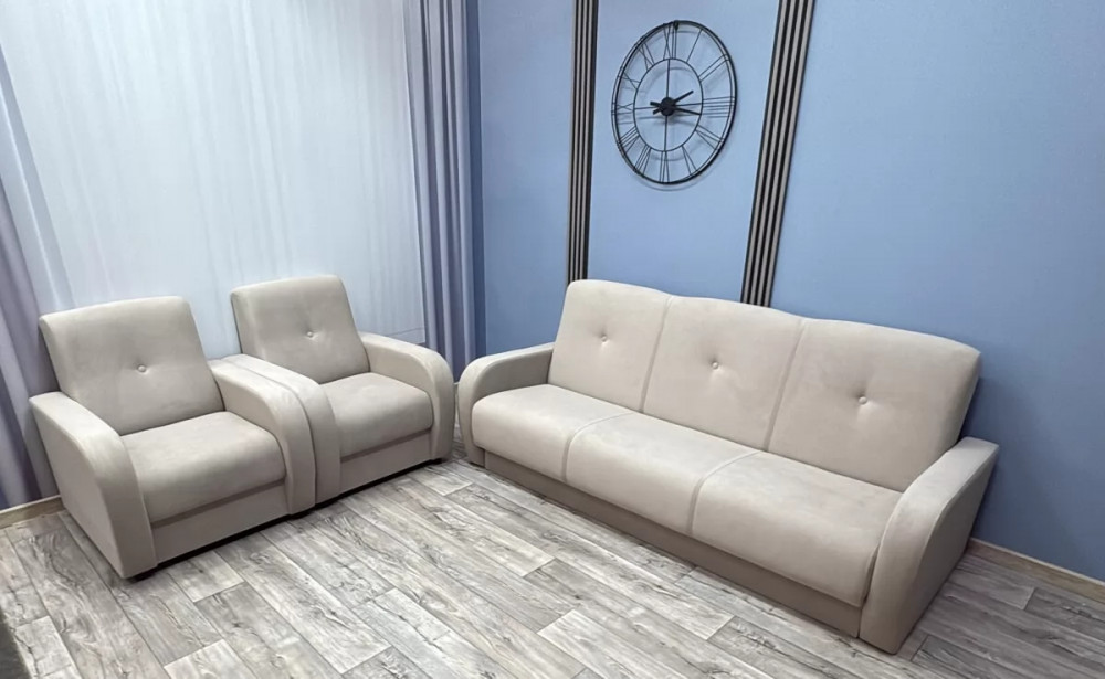 Это лучший вариант соотношения «цена-качество». Спальное место дивана основано на пружинных блоках, соединенных между собой механизмом раскладки «Книжка». Имеется вместительный короб для бельевых принадлежностей. Съемные подлокотники упрощают процесс транспортировки. Два уютных кресла прекрасно дополнят обстановку любого интерьера.