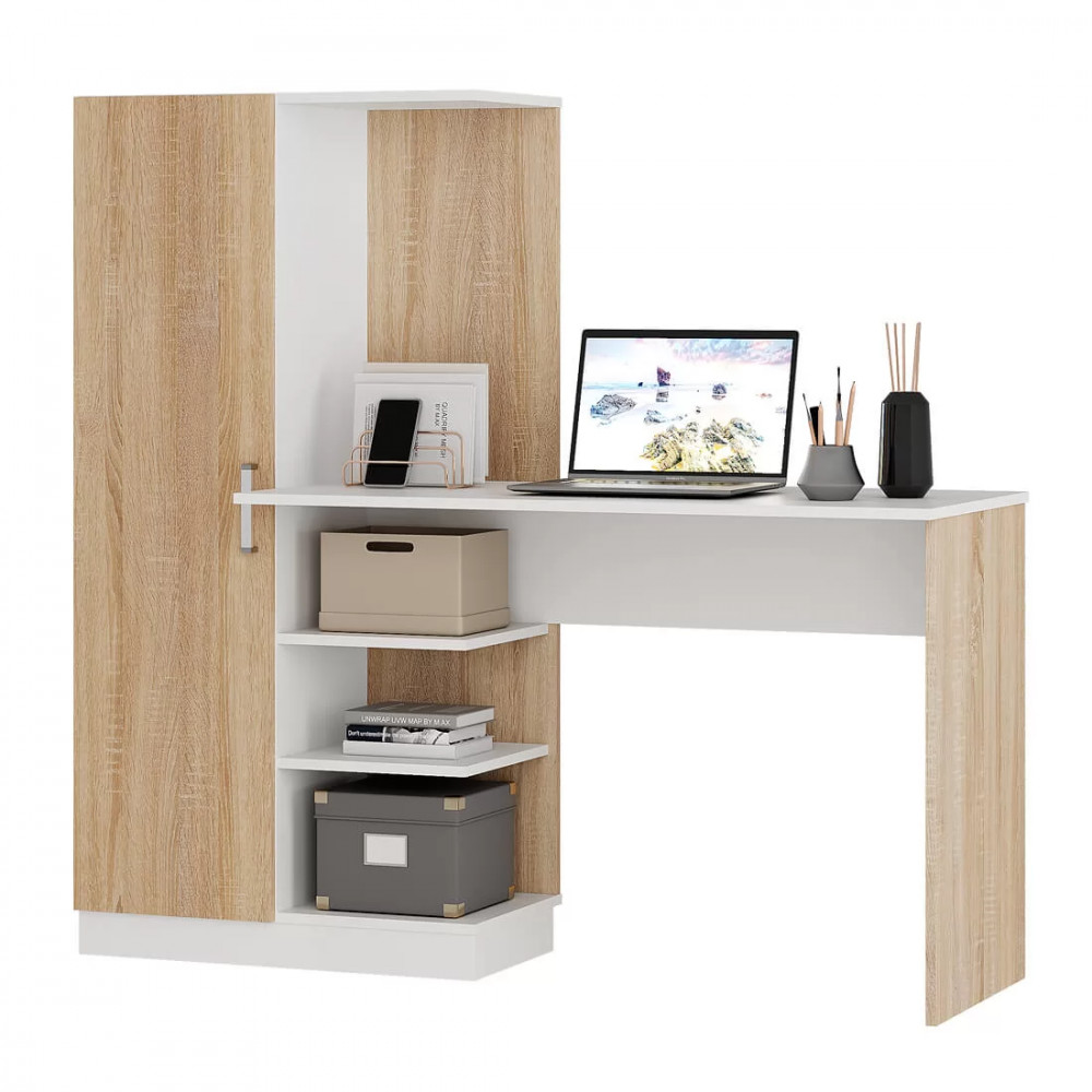 -модель сделана из ЛДСП двух цветов – белого и сонома, -благодаря такому цветовому решению, изделие будет выигрышно смотреться в любом интерьере, -конструкция модели представляет собой вместительную столешницу, зону с открытыми полками, -небольшой пенал с распашной дверцей, в котором можно хранить необходимые для занятий вещи.