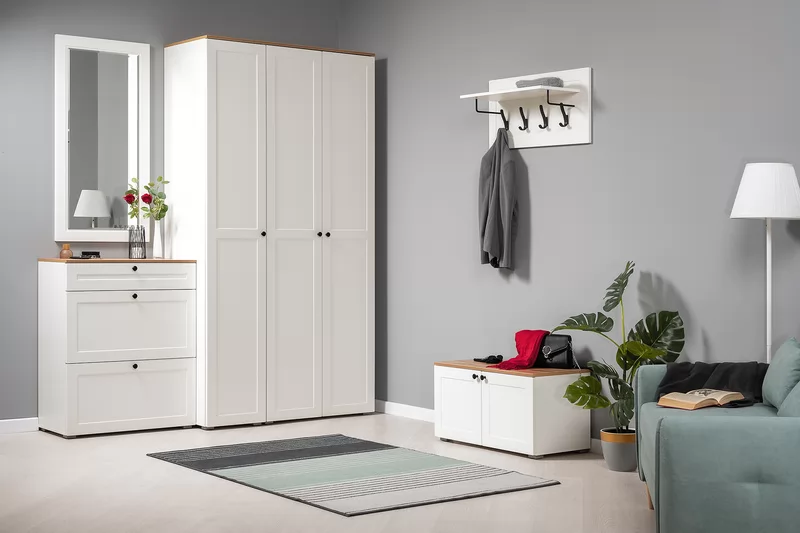 Прихожая доступна в двух цветовых решениях – белый/графит в сочетании с теплым древесным декором.