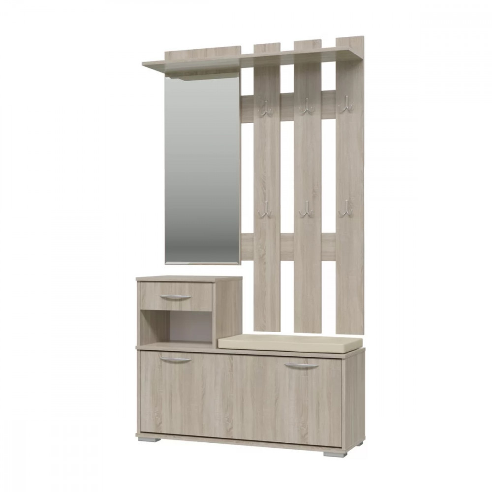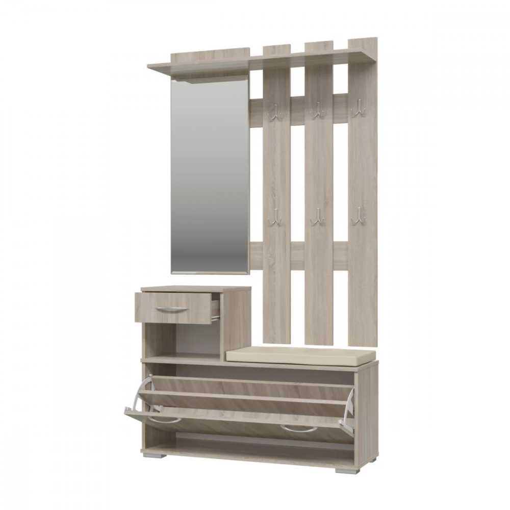 Тумба для обуви состоит из обувницы с откидной дверкой, в которой может разместиться до 8 пар обуви, выдвижного ящика для мелочей и открытой ниши.