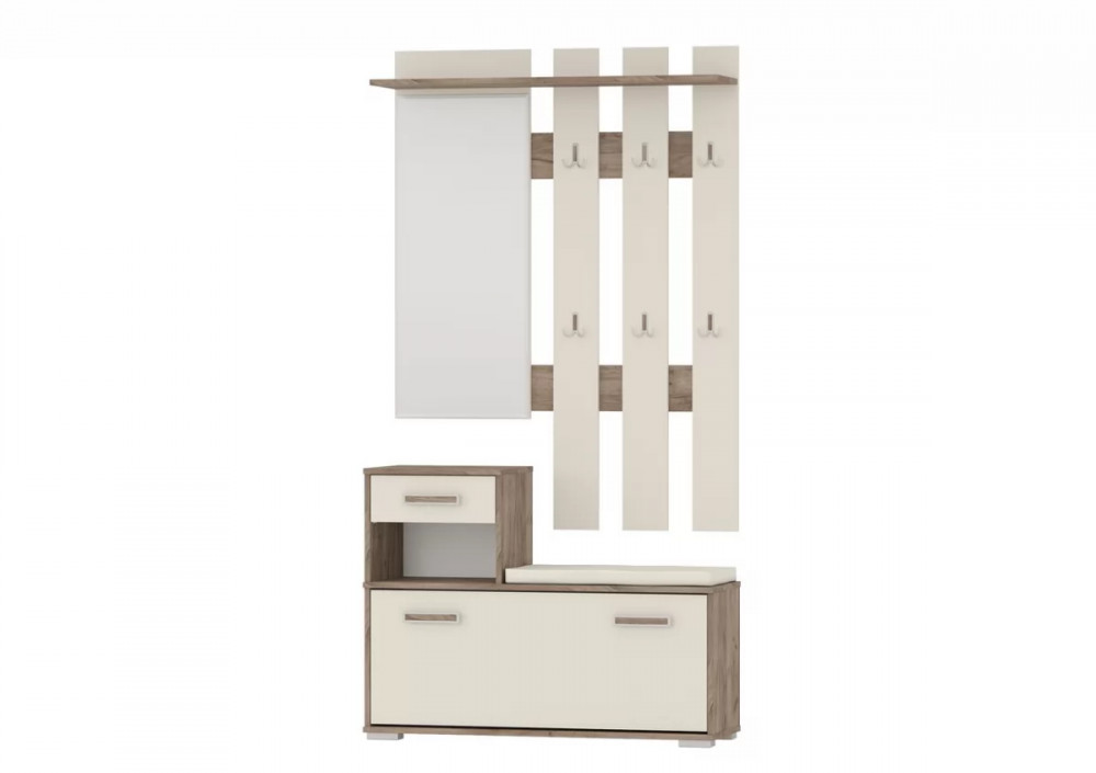 Вешалка оборудована шестью крючками для одежды, антресольной полкой для головных уборов и большим зеркалом.