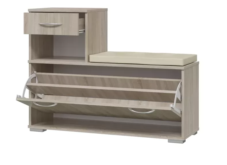 Прихожая "Лира" - компактная мебель для небольшой квартиры. Вешалка оборудована шестью крючками для одежды, антресольной полкой для головных уборов и большим зеркалом. Тумба оборудована выдвижным ящиком, обувницей, и мягким элементом для сидения.