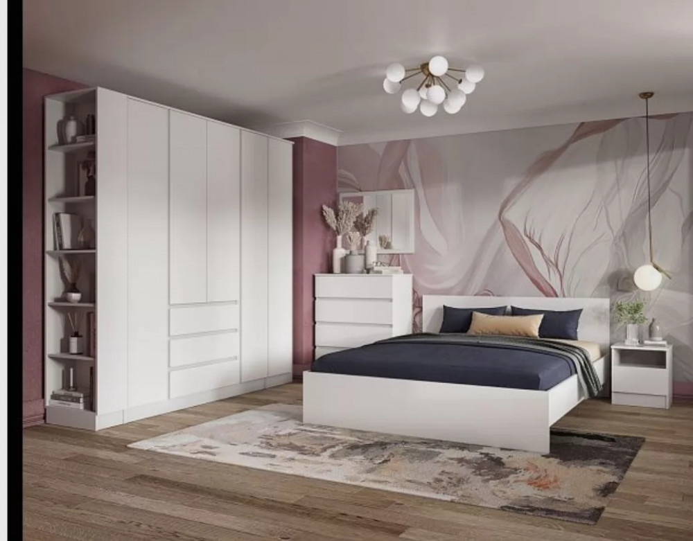 ОсобенностиОтсутствие лицевой фурнитуры. Царги кровати не до пола, основание кровати-настил из ДСП 2С идет в комплекте с корпусом. Кровать можно дополнить мягкой накладкой, из ткани Велюр Серого цвета. Модуль МСП-21 может быть выполнен в 2 цветах: Белый с тиснением «Древесные поры» или Графит Серый. В комоде МСК-21 ниша выполняется в цвете Графит Серый. Спальню можно собрать в одном стиле с гостиной