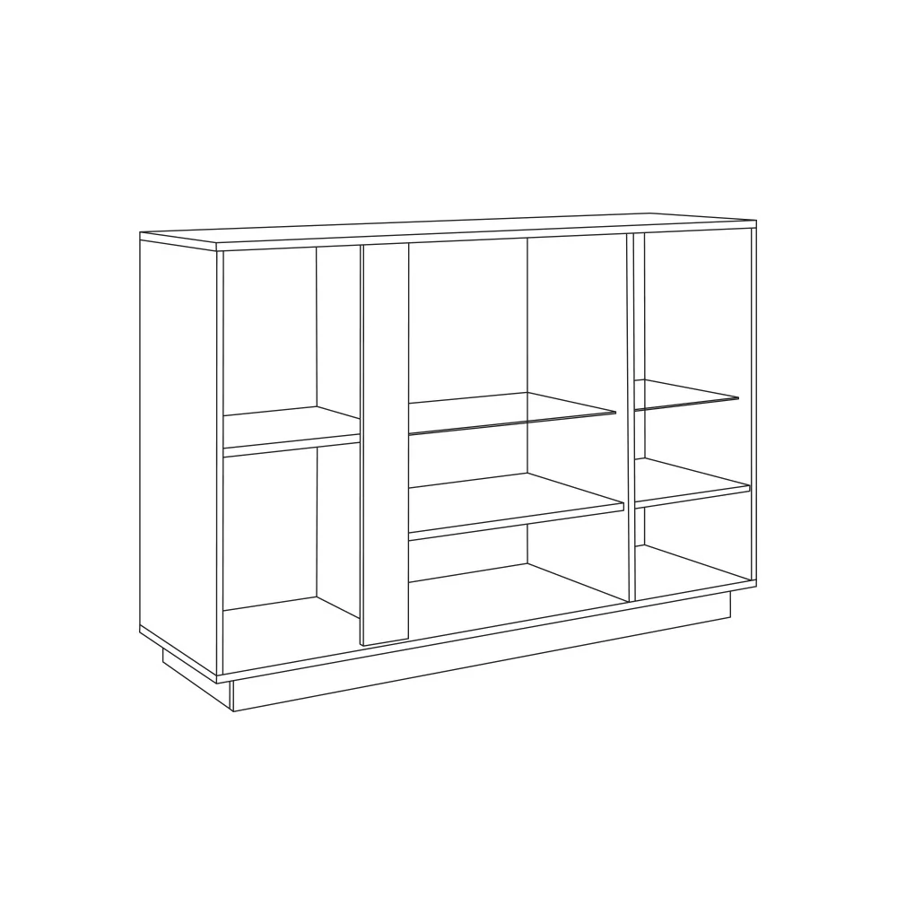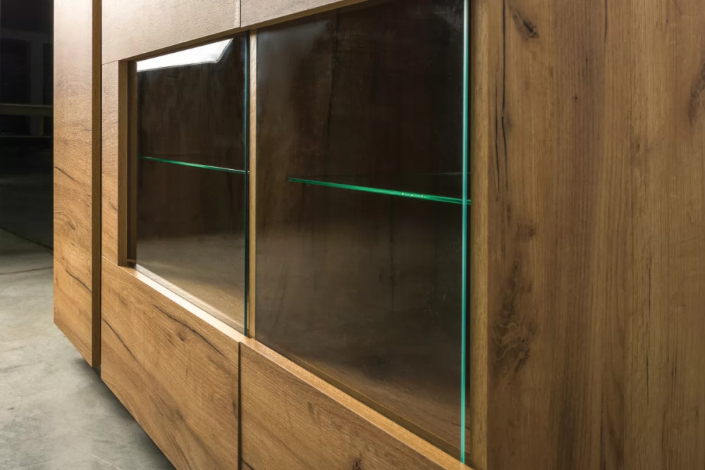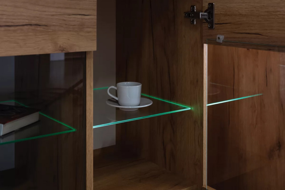 Комод из модульной серии "Арчи" включает в себя секцию с глухой дверцей и ниши со стеклянными полками, оснащенные подсветкой.
