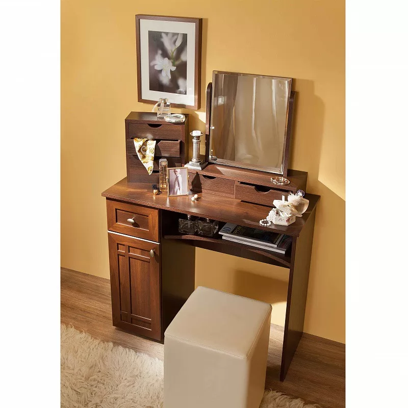 Туалетный столик с тумбой и выдвижным ящиком - самый удобный, вместительный и при этом скромный по габаритам вариант. Небольшой ящик на шариковых направляющих полного выдвижения. Они обеспечивают максимальный доступ к содержимому ящика и плавность его хода. Количество ящиков можно увеличить: установить на столешницу Sherlock 54 Ящики. За рамочным фасадом просторная ниша с полкой, регулируемой по высоте. Полка под столешницей с фигурным вырезом позволит комфортно сидеть за столиком человеку высокого роста. Сам по себе туалетный стол соответствует по высоте нормам ГОСТ и может использоваться как письменный или для работы с ноутбуком. Зеркало докупается отдельно.